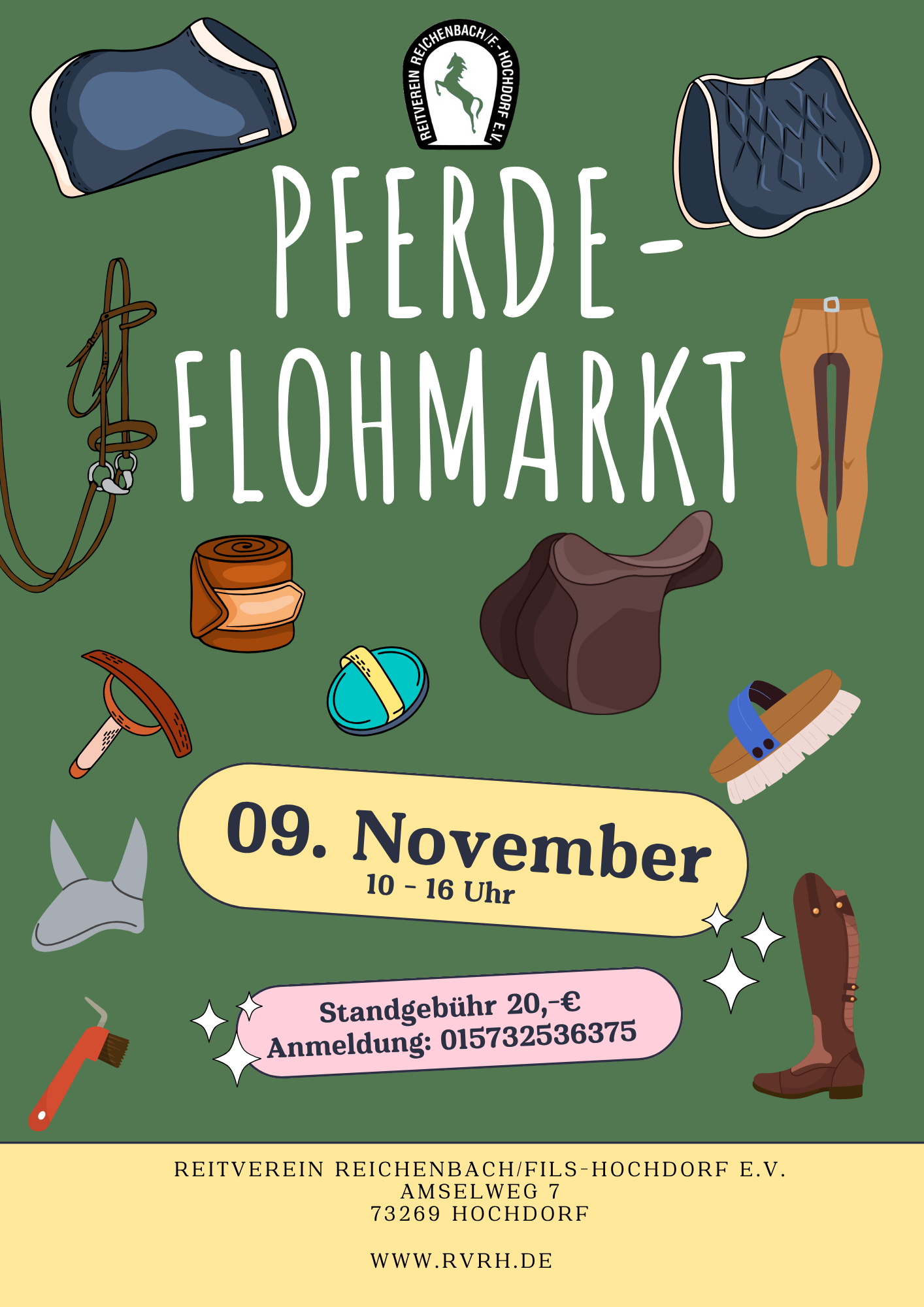 Am 09. November 2025 findet auf unserer Anlage wieder der beliebte Pferdeflohmarkt statt! Zwischen 10:00 und 16:00 Uhr können Reiterinnen und Reiter, Pferdefreunde und Interessierte nach Herzenslust stöbern, kaufen und verkaufen.